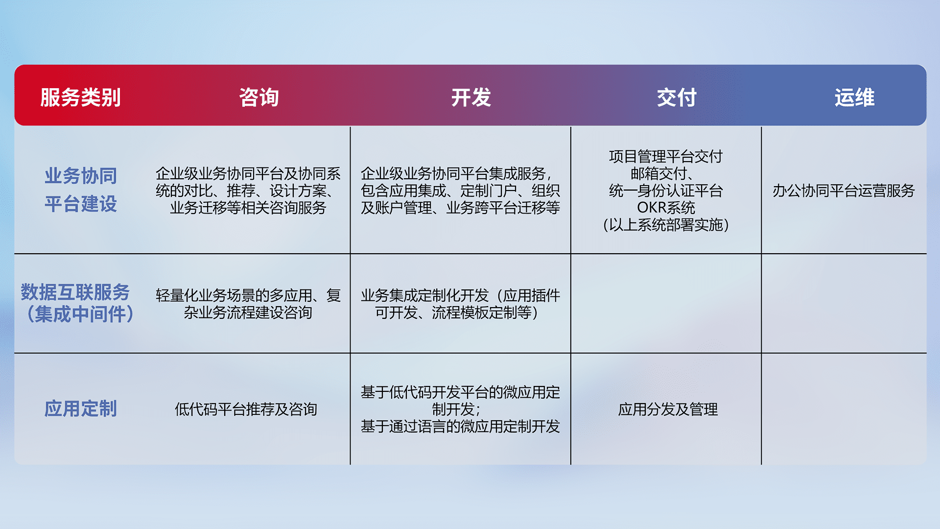 针对钉钉、、企微、、、IDaas等平台级产品提供产品的规划、、、方案、、交付、、、定制化开发等服务,,实现如统一协同办公、、、智能客户服务、、、、混合会议管理、、、智能数据查询、、、、等业务场景,,实现数字化转型。。。