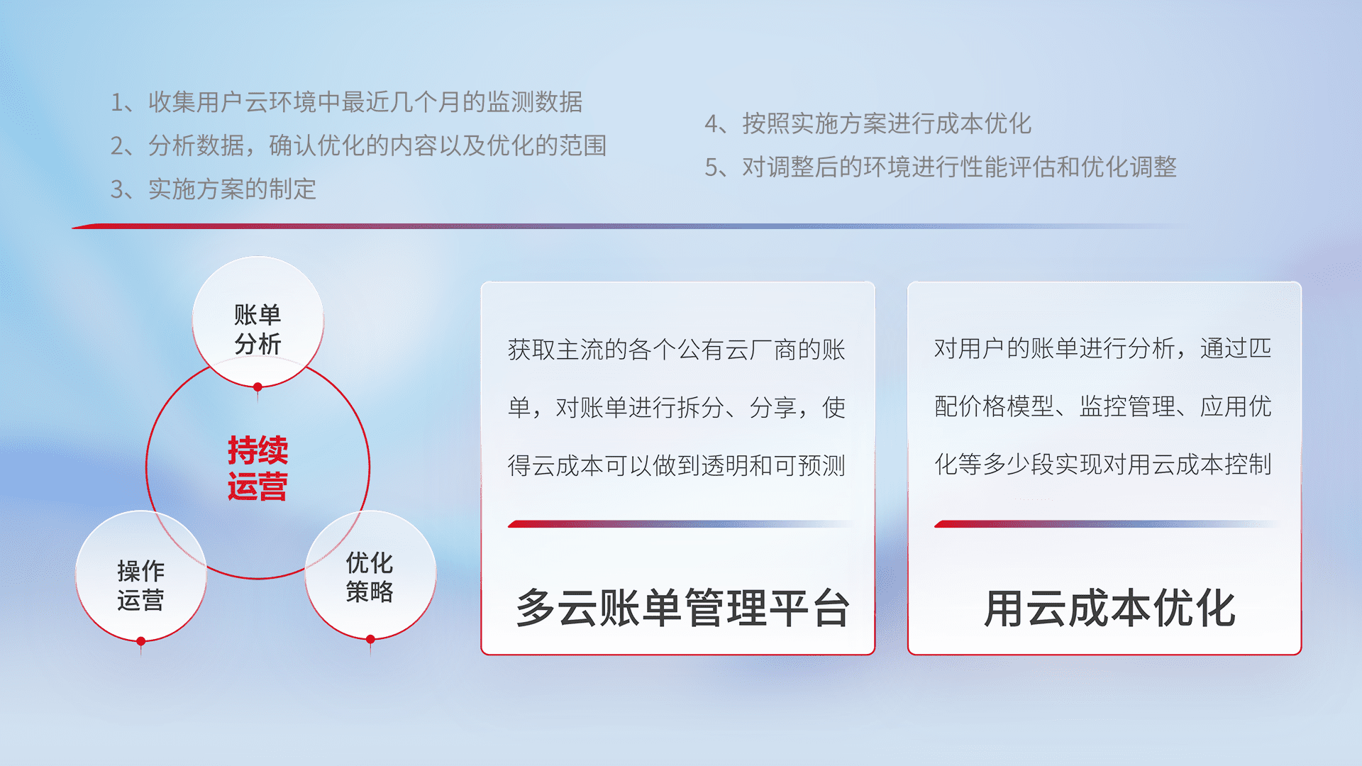 通过多云纳管,,,以统一的资源数据模型把客户的云资源进行抽象和封装,,,,进而实现对多云资源的统一操作,,,,保障云资源管理的可靠性、、、稳定性与可用性。。量身定制化运维内容,,配置、、、开发运维、、、、补丁管理、、、备份、、、、监控、、、、认证和访问管理、、、、审计和日常巡检等,,保障在用云过程中的可靠度,,稳定度以及高可用率。。。。